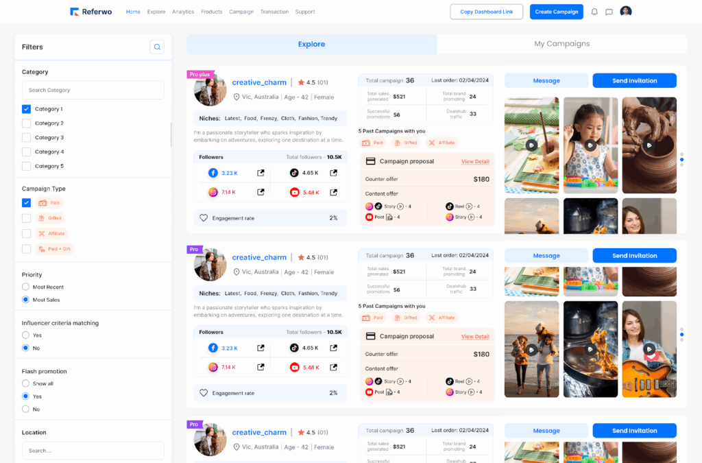 Referwo’s creator discovery system moves beyond subjective metrics, such as follower counts, to focus on audience alignment and proven performance. Brands can filter potential influencers based on specific niches, geographic locations, audience demographics, and past campaign results to find creators whose followers match their ideal customer profile.