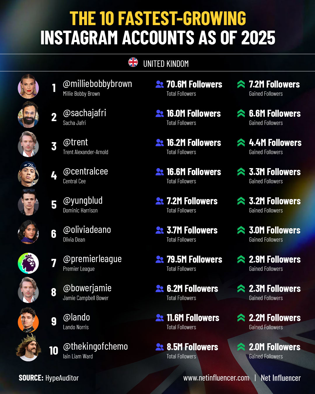 Millie Bobby Brown added 7.2 million followers in 2025, leading a list dominated by “Stranger Things” cast members, footballers, and a motivational creator battling brain cancer, according to data from HypeAuditor. British artist Sacha Jafri grew his account by 70%, while Premier League content and Formula 1 driver Lando Norris rounded out the top 10.