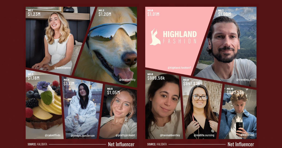 @highland.fashion7 holds sixth position with $1.01 million, down from December’s fifth-place position at $1.83 million. The creator operates with 245,900 followers and generates 12.5 million content views. Best-selling products include women’s fashion items, with an average unit price of $20.13.
